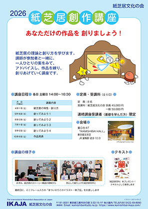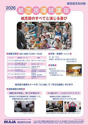 紙芝居文化の会 2026 紙芝居連続講座、2026 紙芝居創作講座、2026 紙芝居ゼミナールの講座内容・日程が決まりました。会員のみなさまには、1月下旬頃チラシをお届け予定です。