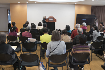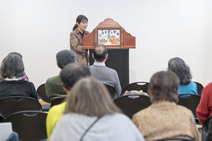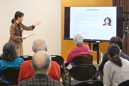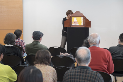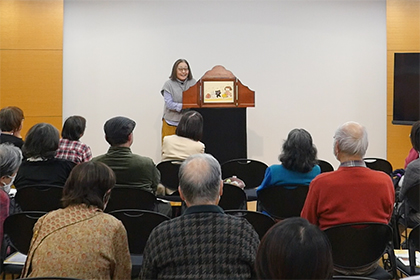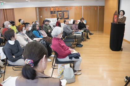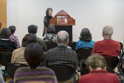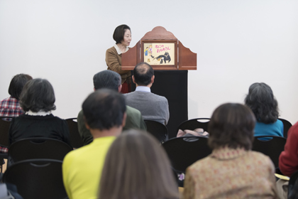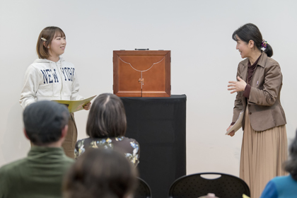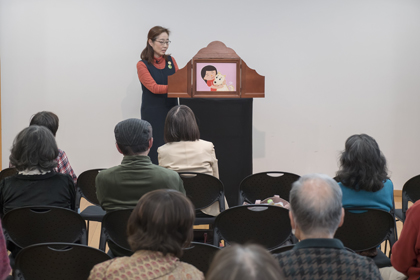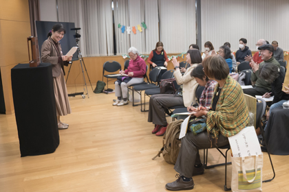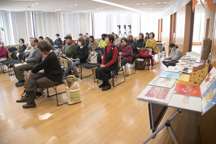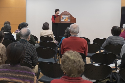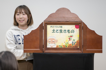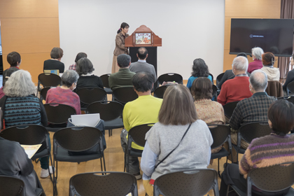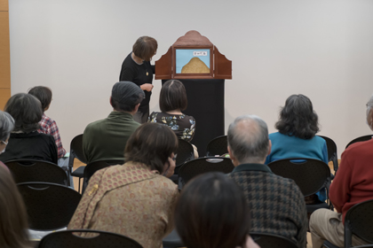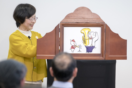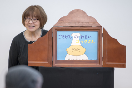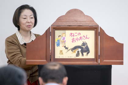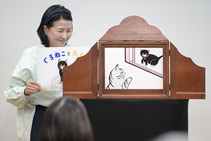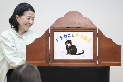 創作講座修了生、加藤里美さんによる手作り紙芝居『くろねことたんぽぽ』の実演