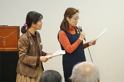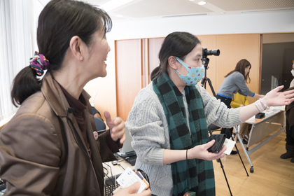 インタビューを受ける野坂悦子共同代表、飛び入り参加者