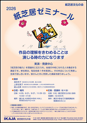 紙芝居文化の会 2026 紙芝居連続講座、2026 紙芝居創作講座、2026 紙芝居ゼミナールの講座内容・日程が決まりました。会員のみなさまには、1月下旬頃チラシをお届け予定です。