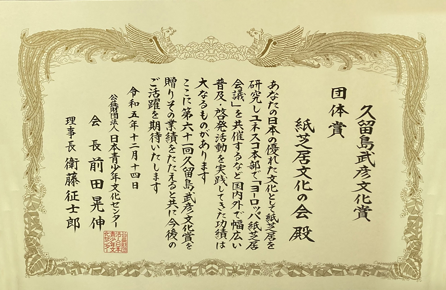 紙芝居文化の会が第61回久留島武彦文化賞【団体賞】を受賞しました。