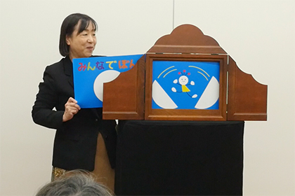 絵本と紙芝居の違い、紙芝居の歴史、紙芝居の演じ方、マイ紙芝居をもちましょう、など紙芝居の基本を学びました