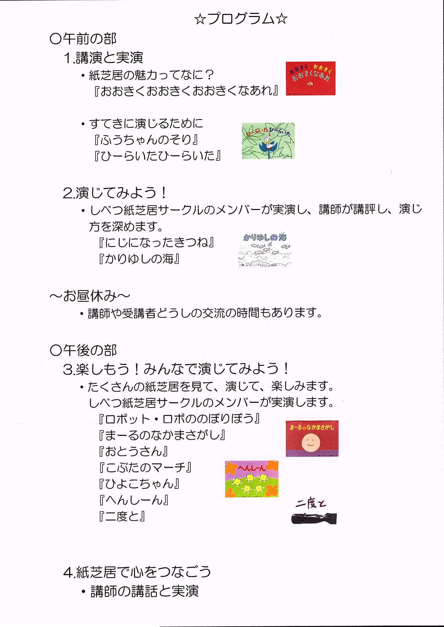 士別紙芝居サークルのメンバーが『にじになったきつね』、講師が『ひーらいたひーらいた』を思いをこめて実演し、午前の部を終わりました。