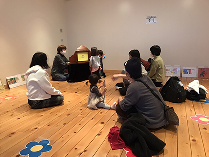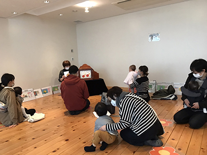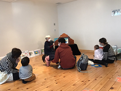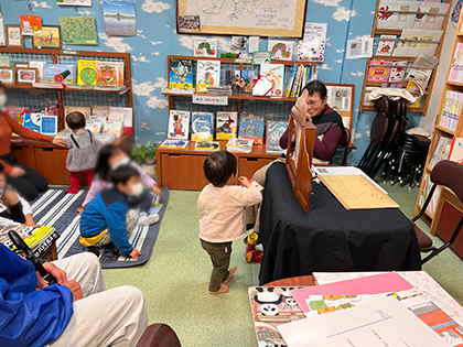 子ども読書空間「ブックキャンプ」で紙芝居をしました。午前は読書空間の愛称が決まる式典があり、参加者は大人の方がほとんど、午後は親子さんという日になり、大人も子供も紙芝居の楽しさを共有しました。