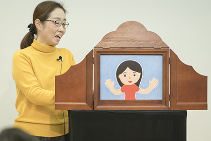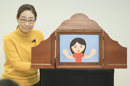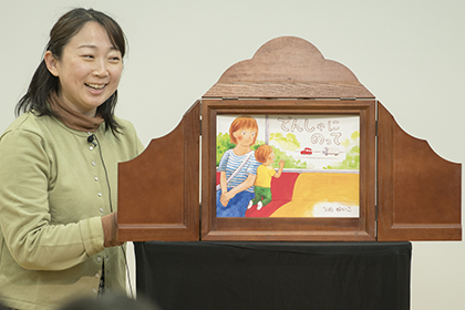 創作講座修了生、築野友衣子による手作り紙芝居『でんしゃにのって』の実演