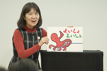 草郷緑彩さんによる『みんなでぽん!』(まついのりこ脚本・絵)の英語による実演